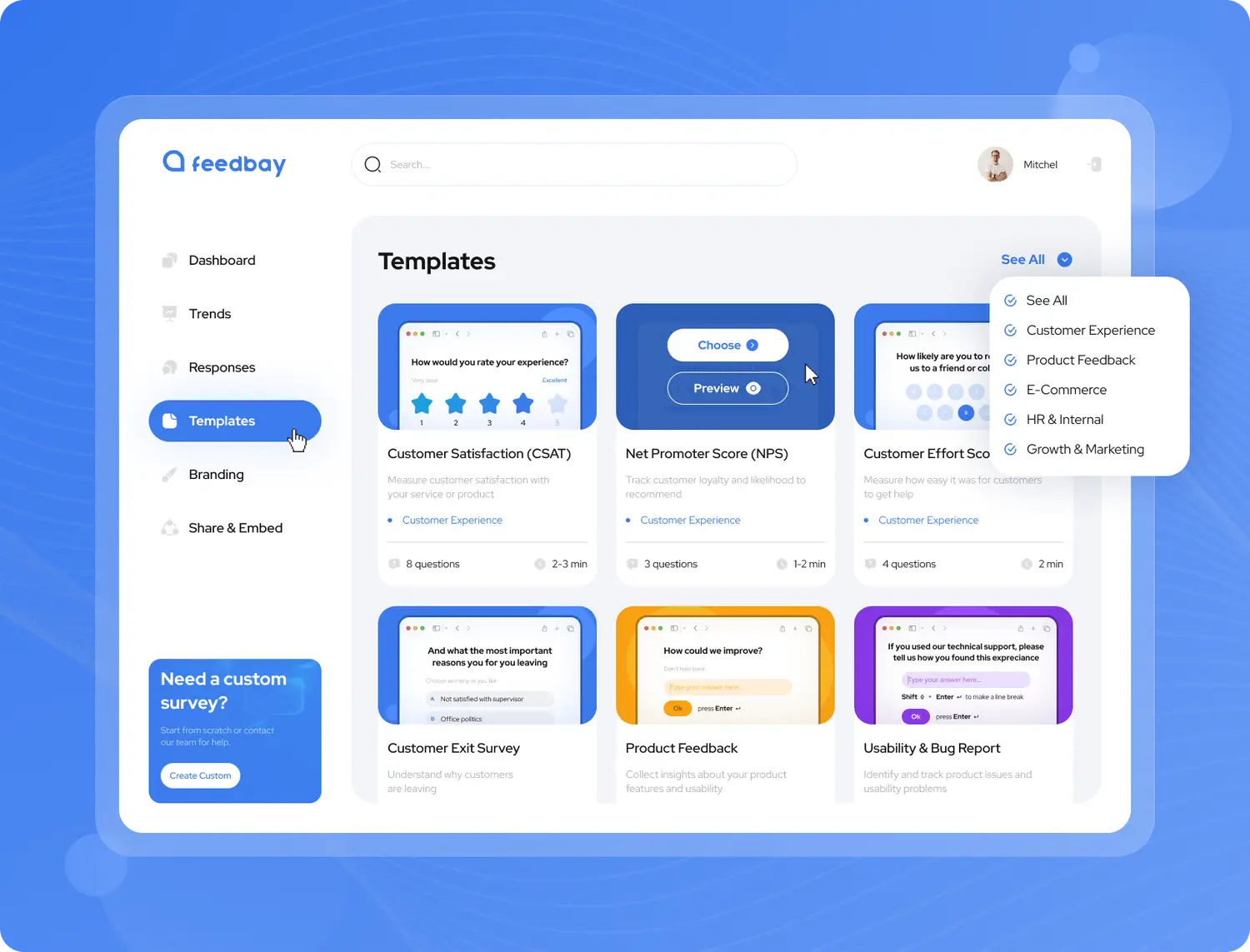 FeedBay is built for product teams, e‑commerce businesses, marketers, consultants, startups, and anyone else who needs actionable feedback. Our ready‑made templates (NPS, CSAT, product feedback, etc.) and flexible question types let you tailor surveys to your exact use case—whether you’re validating a new feature, measuring loyalty, reducing checkout friction, or gathering employee sentiment.