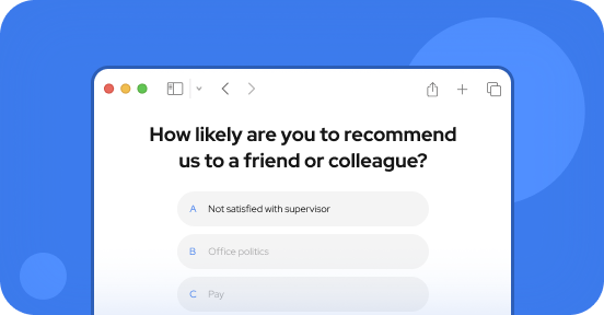 You can share surveys via a short link, generate a QR code, embed them in your website or SaaS app, or include the first question directly in an email. Your respondents don’t need an account, and every survey is mobile‑friendly by design.