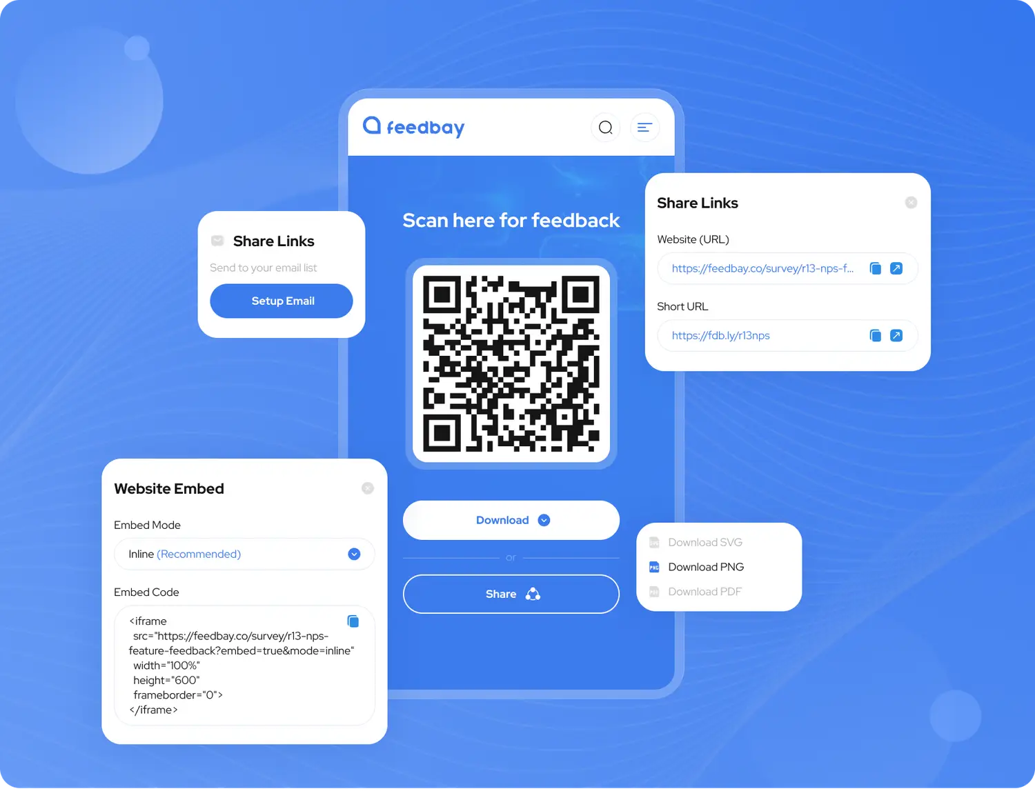 Share via short link or QR code, or embed directly on your site for maximum responses.