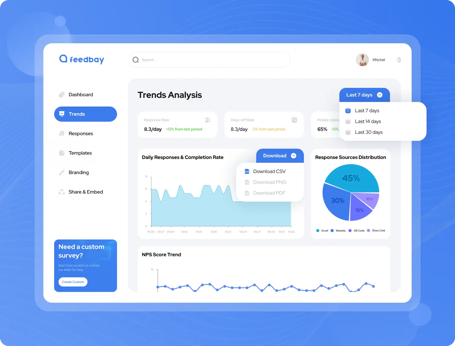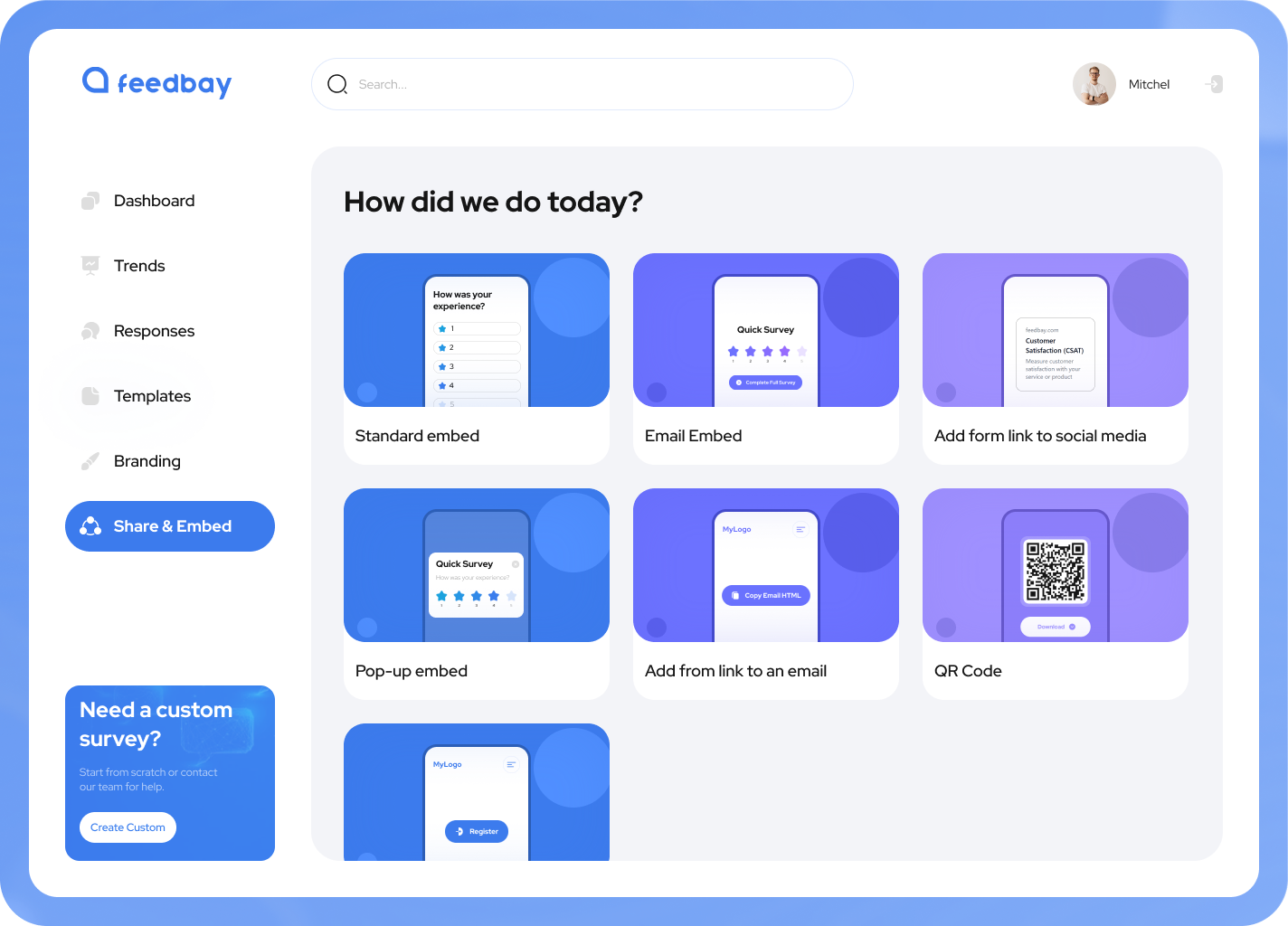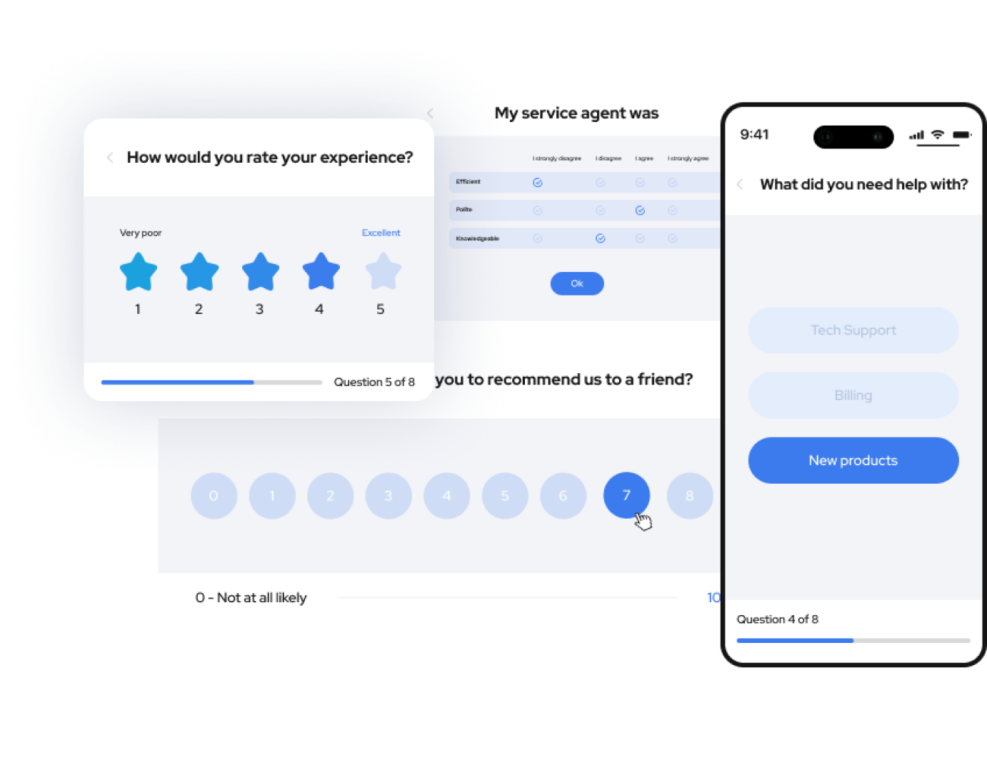 Pick a template (NPS, CSAT, product feedback), customize questions with the drag-and-drop builder, and add your logo and colours. Works great on desktop and mobile.