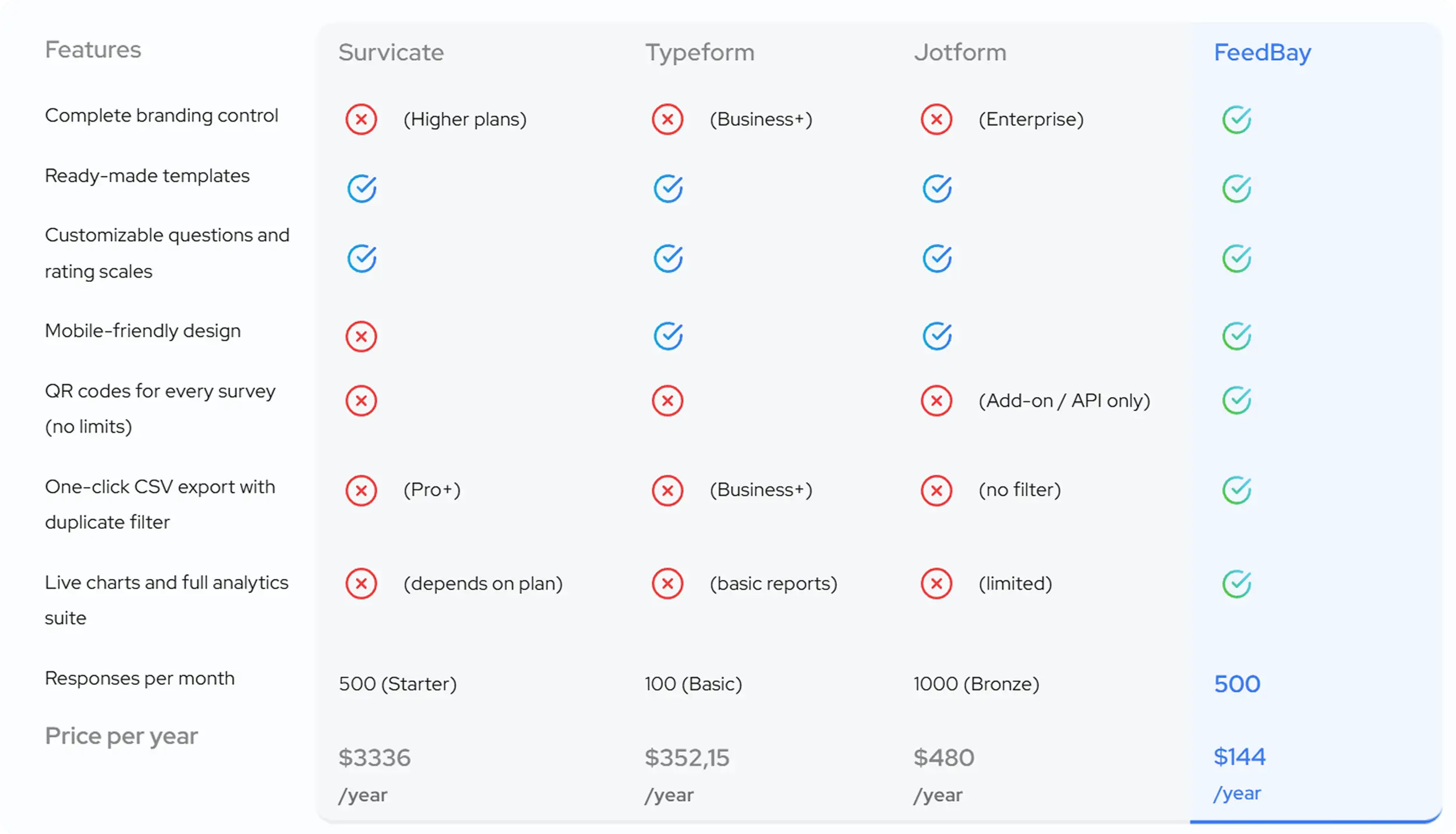 Yes. With FeedBay, you can build surveys in minutes, share them via link, QR, email or website embed, see responses in real time with clear charts and filters, and export a clean CSV in one click. Nothing is hidden behind higher tiers—what we promise is what you get.